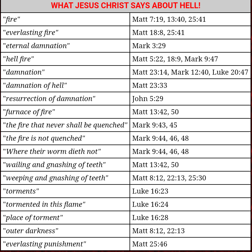 Revelations 21:8 – “But the fearful, and unbelieving … shall have their part in the lake which burneth with fire and brimstone.”