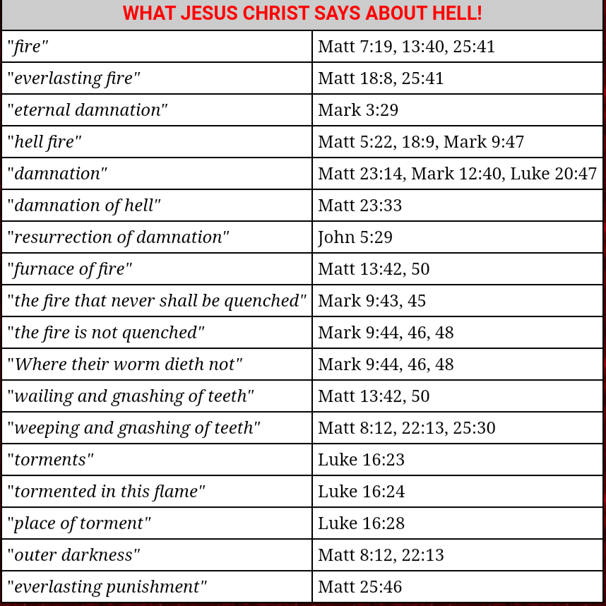 - Matthew 25:41: “Then shall he say also unto them on the left hand, Depart from me, ye cursed, into everlasting fire, prepared for the devil and his angels.”